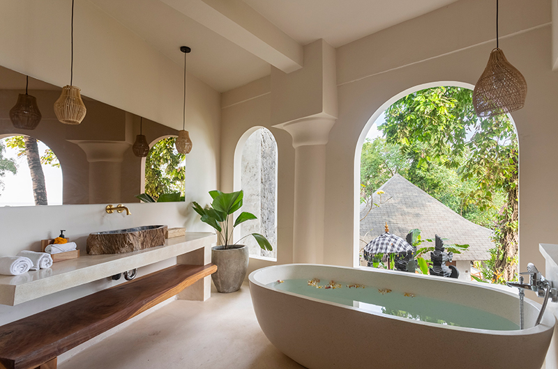 Another master suites is housed on the second floor of the villa as well and boast impressive views of the garden and out overlooking the ocean from their private balconies. This room is furnished with a heavenly king-sized bed. The Sunset Main Suite treats guests to a luxurious alfresco experience with a semi-open ensuite bathroom.