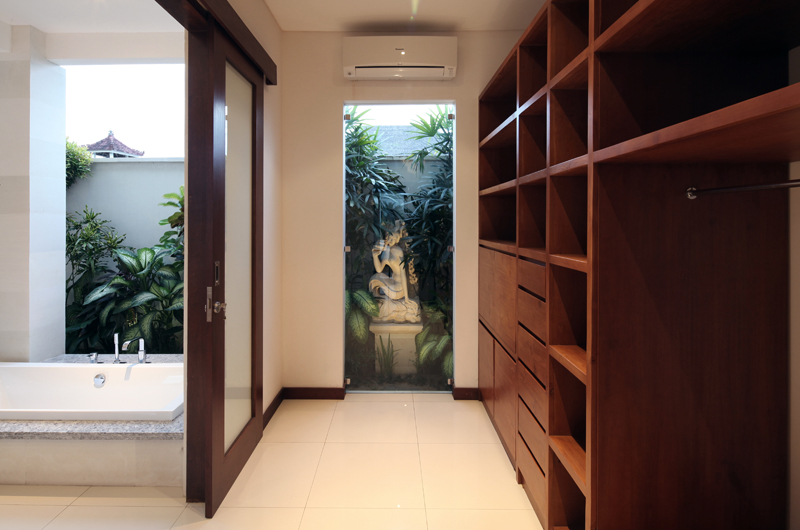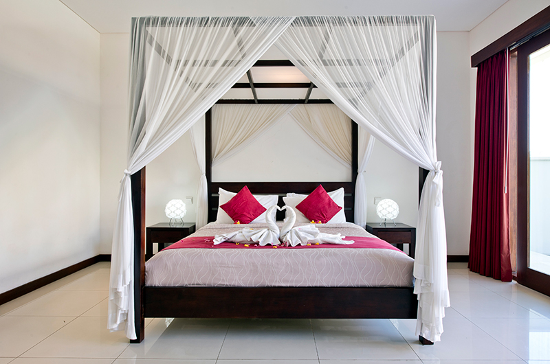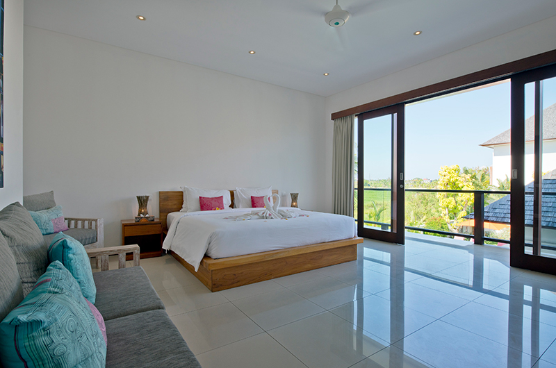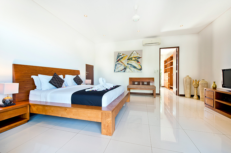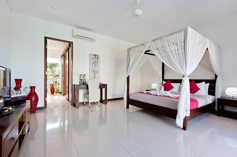 Villa Merayu has five bedrooms. Four bedrooms have king-sized beds and one room has two single beds. There are two bedrooms on the ground floor and three bedrooms are up on the first floor.