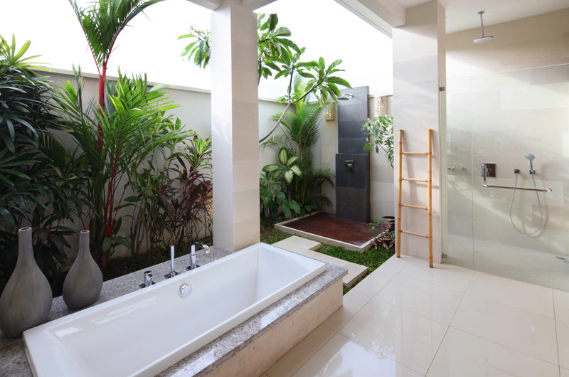 The first bedroom is located on the ground floor close to the pool. The room has a king-sized bed, a TV and an open-air bathroom with a bathtub and shower.