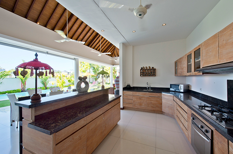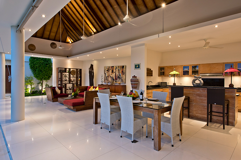 Villa Merayu’s dining table shares the same space with the living room. The glass-topped dining table sits next to a spacious open-plan kitchen.