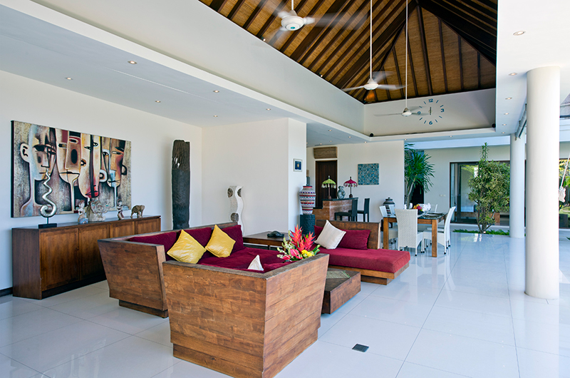 Villa Merayu’s living room has an open-plan design offering direct views of the pool. The room houses plush red sofas and armchairs surrounded by vivid paintings and artefacts.