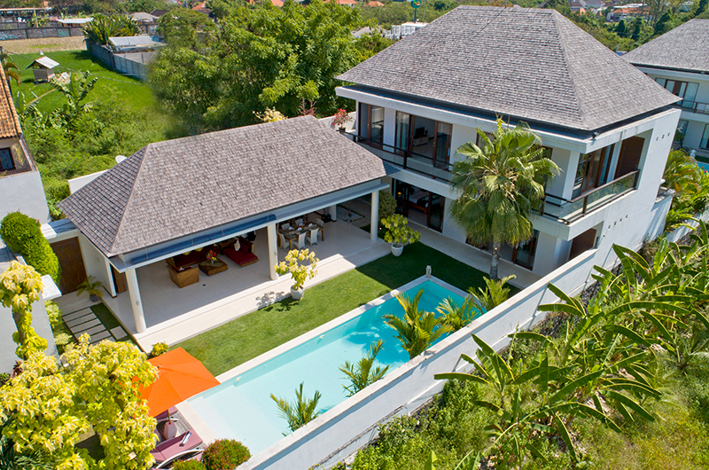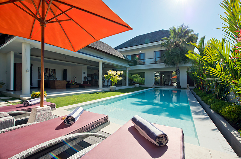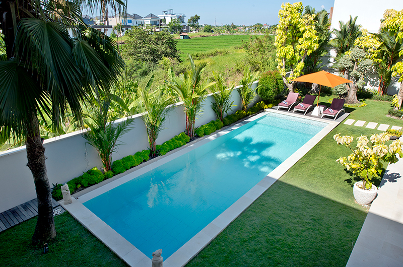 Villa Merayu has a spacious private pool surrounded by a generous lawn and sun beds. The pool is accessed through a few wide steps, so kids can dip their toes without plunging into the deep end.