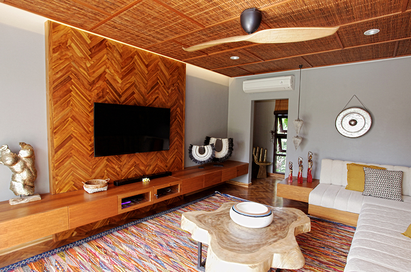 The main living pavilion is a breezy, open-sided Joglo pavilion overlooking the pool and garden. This open-plan space has a relaxed seating area with a rattan sofa and armchairs with a chessboard offering some old-school entertainment. If you prefer to chill out in air-conditioned comfort, the villa also has swanky TV room with a huge L-shaped sofa hugging the wall, positioned before a large flatscreen TV with a DVD player and sound system.