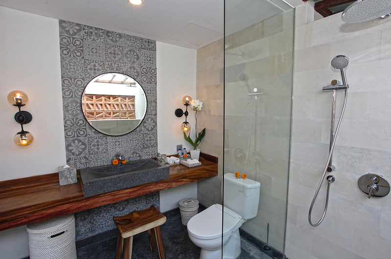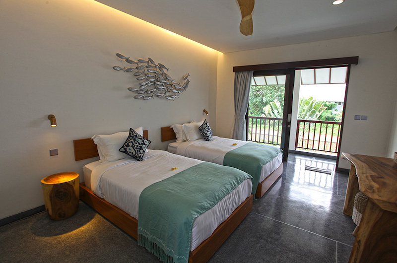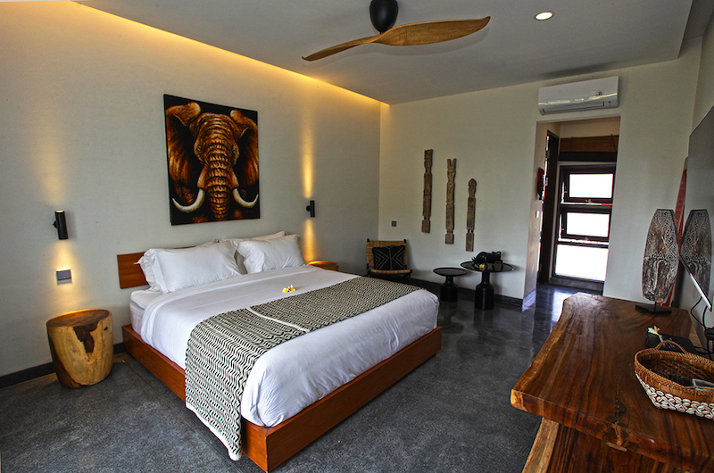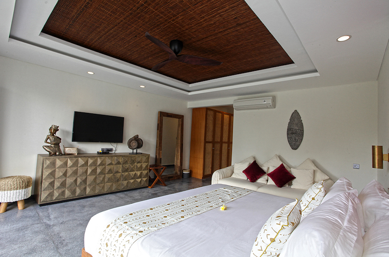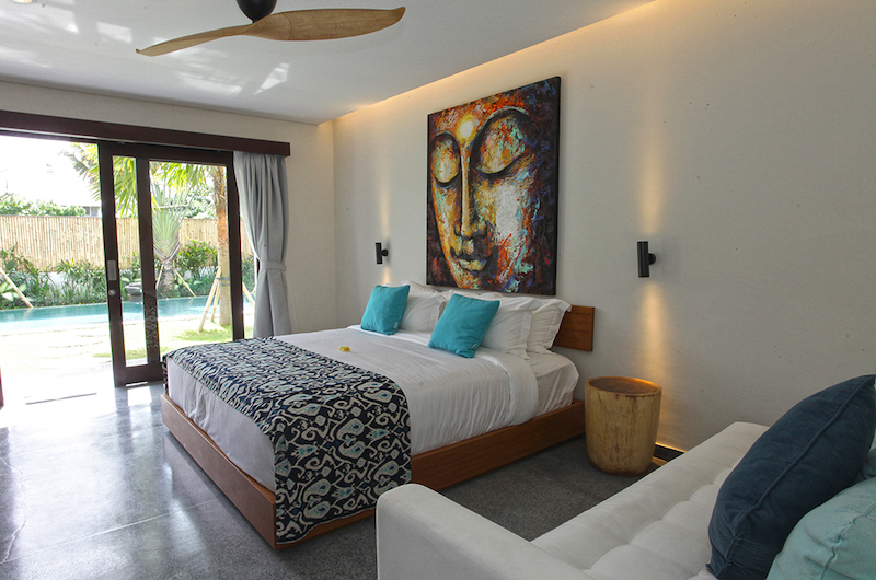 The first bedroom is located on the ground floor by the pool and has a subtle turquoise theme. The room has a king bed, a small sofa and an ensuite bathroom with a shower.