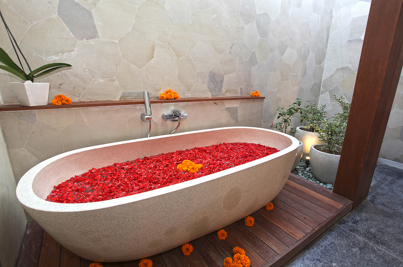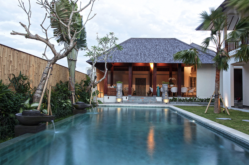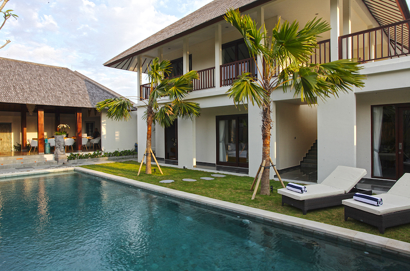The villa is built around a 12-metre long swimming pool surrounded by exotic palm trees. Grab a spot on one of the white sun loungers or steal away for an after-swim nap in the shade of the romantic poolside bale.