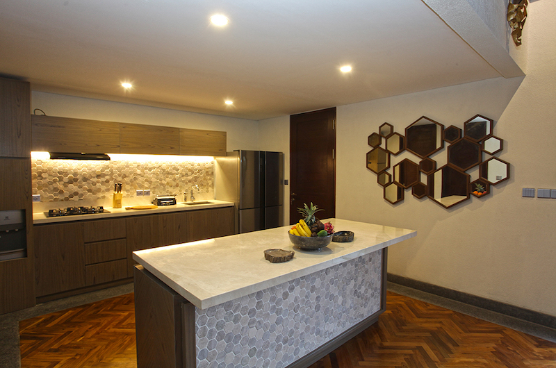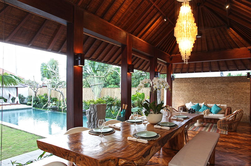 The dining room is housed in the open-plan Joglo pavilion by the pool, allowing guests to dine while gazing at the poolside views. The dining table is crafted from a sturdy piece of natural wood and can comfortably seat all eight guests staying in the villa. The same space includes a well-equipped, open-plan kitchen.