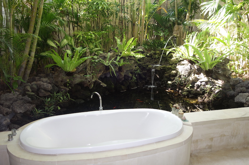 As we discovered each of our bedrooms, we were amazed again: each room has a large bathroom with its own little private garden and outdoor shower! Each room also has a private outdoor seating area which, for couples like us staying together, was very enjoyable. In Seminyak, and a five minutes’ walk from downtown shops and the beach, it is just perfectly isolated from the hustle and bustle of the streets: we could not have found a better location. The staff was extremely welcoming and efficient and made us feel at home in this magical environment. As we relaxed by the pool gazing at this incredible villa, we really felt as though it was straight out of an architectural design book. I hope to back to Bali, and will definitely see to rent Villa Nalina again!