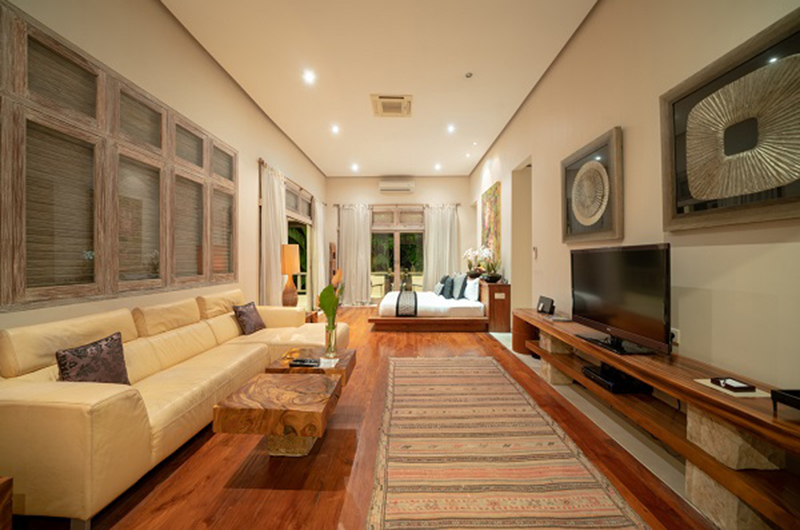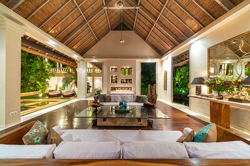 Villa Nalina’s open-plan living room is crowned by a peaked alang-alang ceiling. The room is furnished with white sofas and curated artefacts, with a flatscreen television offering in-villa entertainment.