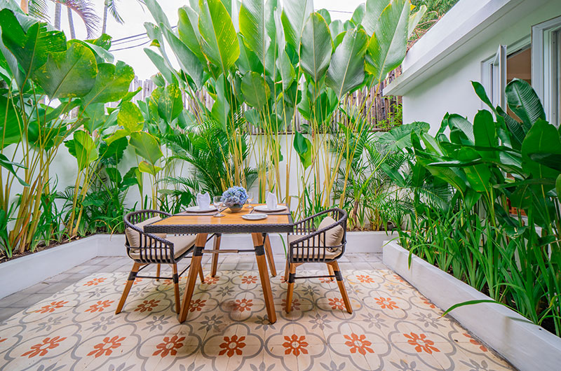Villa Nalina’s dining room is built into the living room, located a few steps above the living room lounge. The dining table can seat 10 guests, with a separate kitchen located to the back of the villa. There is an alfresco dining area by the pool.