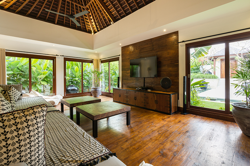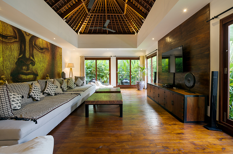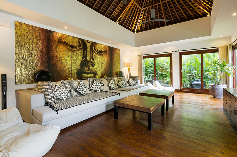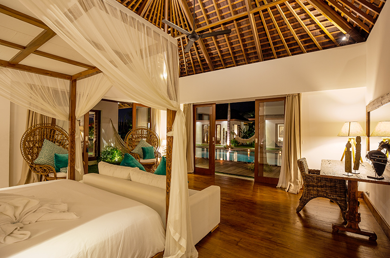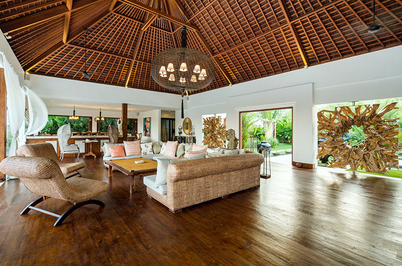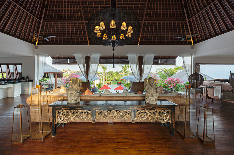 Villa Naty’s massive living area overlooks the pool. The lavish rattan sofa is big enough to host an entire party in an exquisitely elegant setting, tucked beneath a sky-high ceiling. The space is dominated by earthy tones and vibrant local art, with a modern-day take on a glamorous chandelier painting the room with a soft glow.