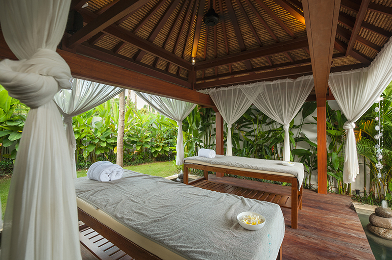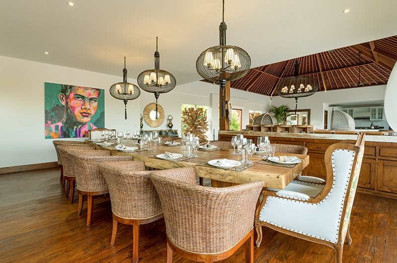 Villa Naty’s dining table shares the same fluid space with the lavish living area. The wooden table sits bathed in natural light streaming in unhindered, thanks to the light open-air design of the space. The table sits up to 12 people and is adjoined by a fully equipped kitchen. For some unforgettable alfresco entertaining, set the table outside in the villa’s decked-out garden gazebo.