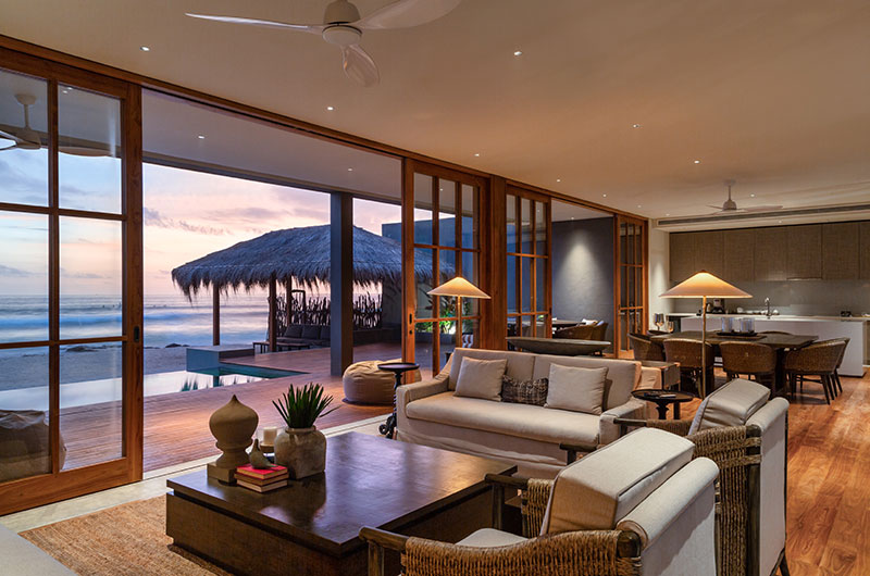 The living room strikes the perfect balance between comfort and elegance. There are plush sofas and armchairs to relax on, with a soft colour palette creating a soothing ambiance. The room is framed by full wall windows offering blissful views of the pool and beach.