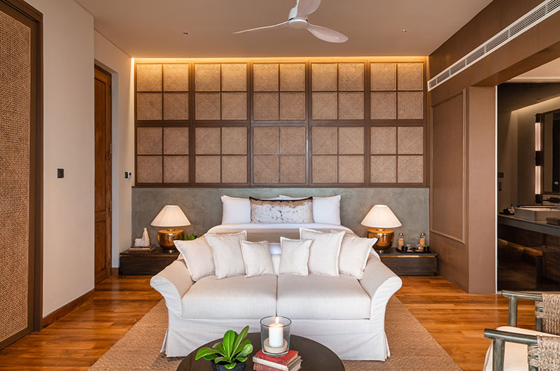 This is one of two bedrooms located on the upper floor. The room features a king-sized bed, seating area, and a beautiful ocean view balcony. The ensuite bathroom is fitted with a shower, twin vanities, and a toilet.
