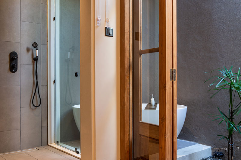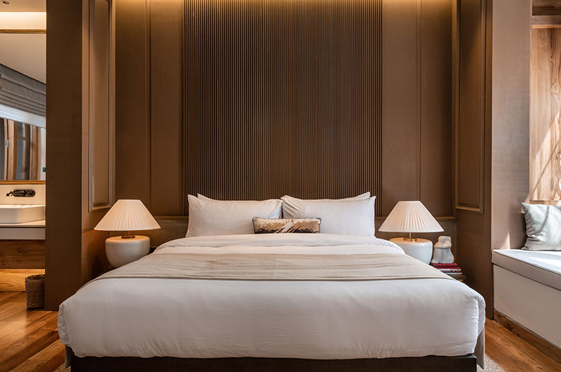 Villa Noosa features four bedrooms. The bedrooms have a light and elegant décor relying on white and timber tones, with views looking out to tranquil courtyards or out to the clear blue sea. There are two bedrooms on the ground floor and two on the upper floor. All four rooms come with king-sized beds and luxe ensuite bathrooms.