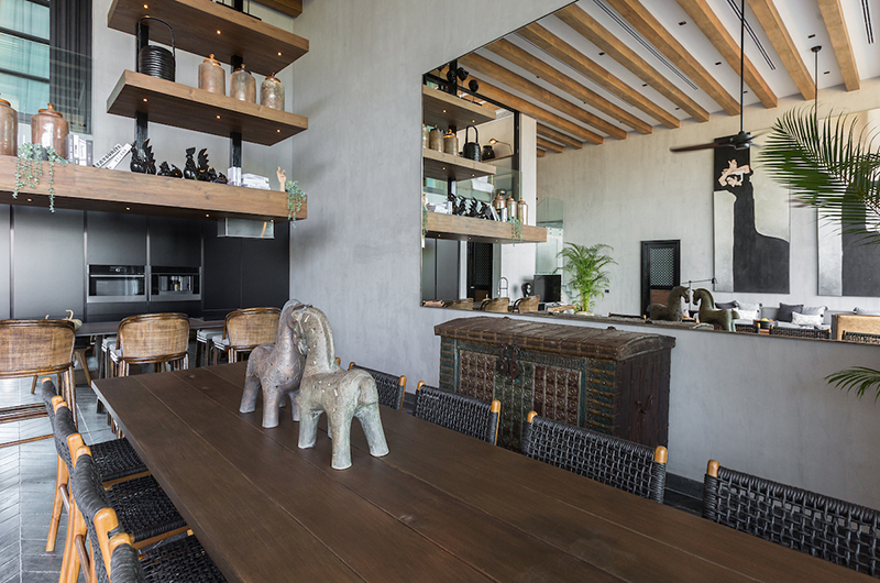 The dining area is a fluid extension of the living room, with a long elegant dining table able to accommodate up to 12 guests. To the back of the room is a modern open-plan kitchen, fully equipped for preparing gourmet meals. Alternatively, guests can enjoy meals out on the patio, with views looking all the way out to the ocean.
