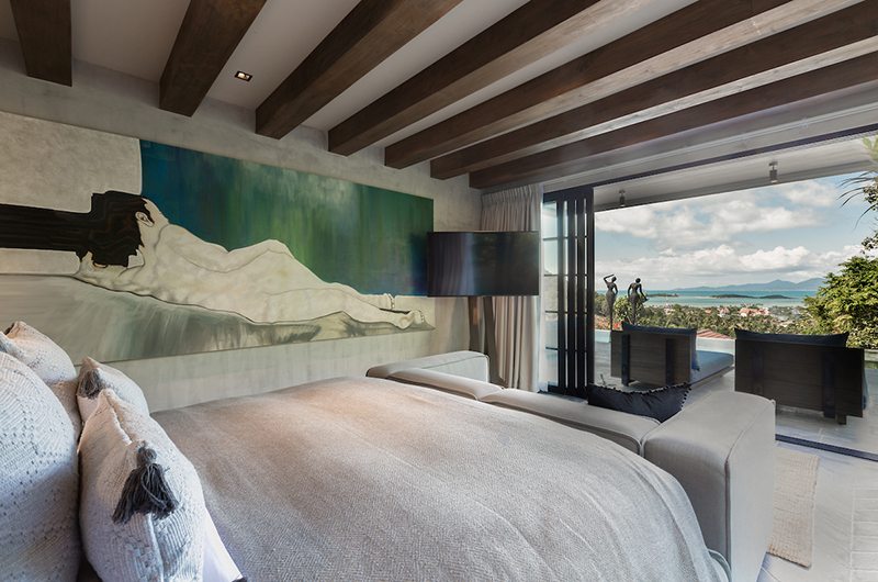 The spectacular lounge room has a soaring high ceiling, with sliding glass doors opening to the panoramic poolside terrace. There is plenty of room to relax here, with a plush grey sofa and matching arm chairs surrounding a low slung coffee table. Modern pieces of art line the walls – though they have some stiff competition in the spectacular tropical views waiting just beyond. There is also a large flatscreen TV in this space, for those evenings when you prefer to stay in to Netflix and chill.
