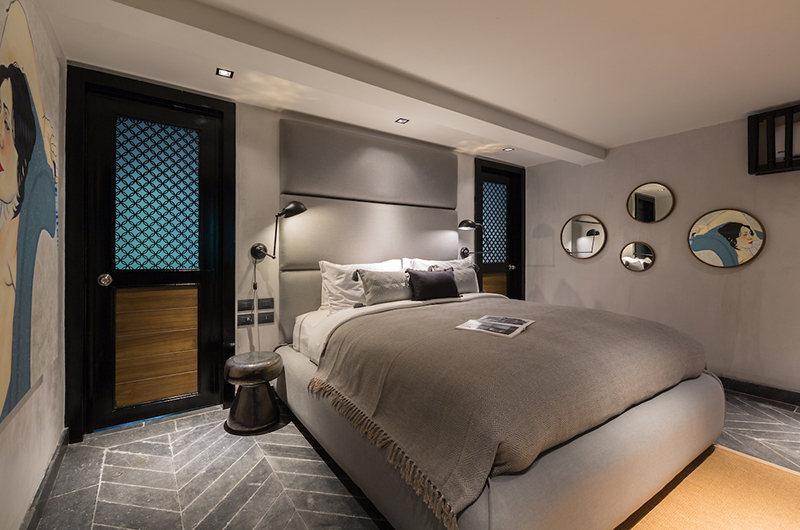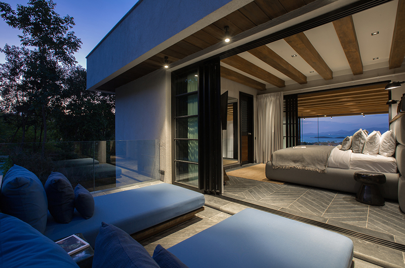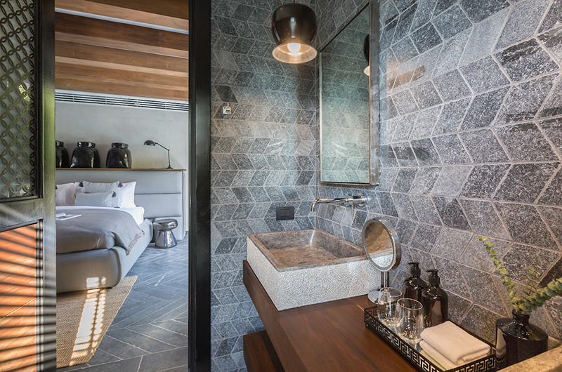 The villa’s poolside terrace works as stunning alfresco living room, with plush blue lounge furniture offering the perfect spot for drinking in the views. The lounge area gives out to a 14-metre infinity pool. The pool includes an in-built Jacuzzi and is flanked by stunning modern sculptures. The epic tropical views reaching out to the neighbouring islands are the icing on the cake!