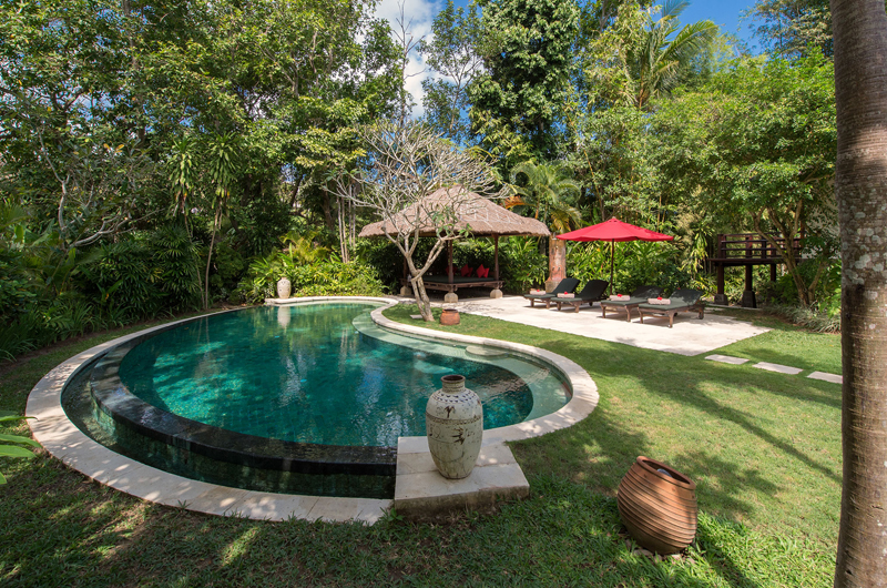 Villa Pangi Gita’s gorgeous tropical gardens feature a sumptuous 12-metre swimming pool in a freeform lagoon shape. There are sun loungers lining the pool, with a bale gazebo offering a break in the shade. The vast gardens offer plenty of space to explore and settle down for quiet contemplation.