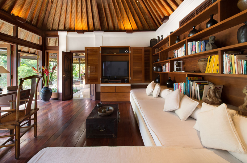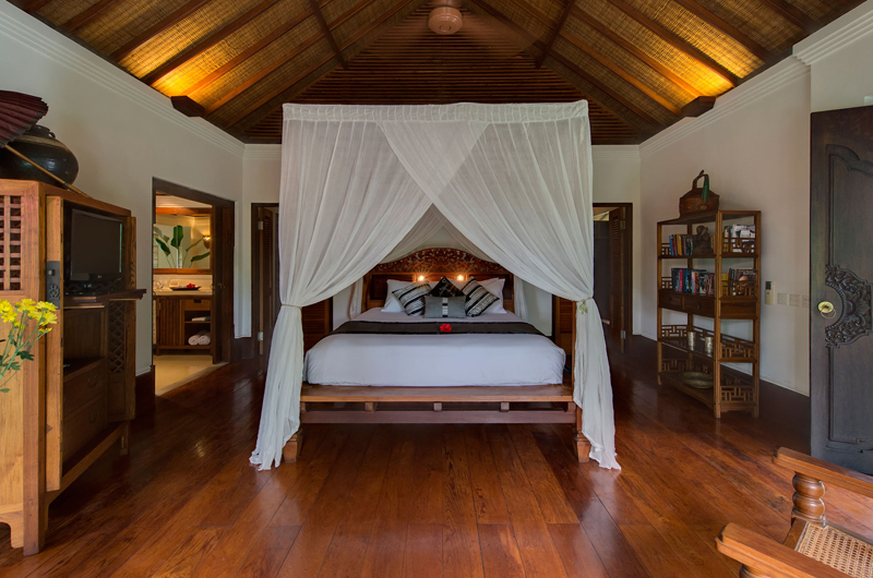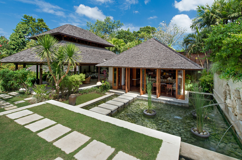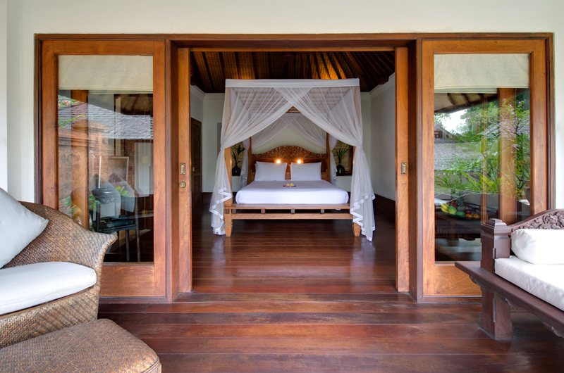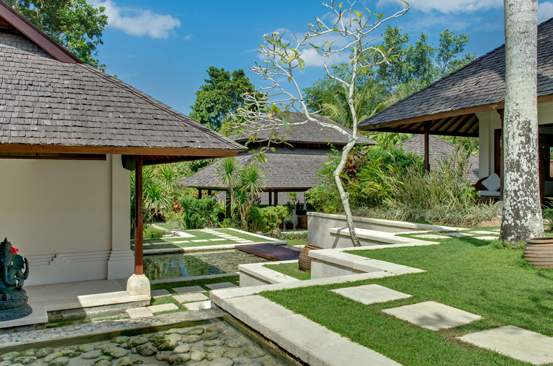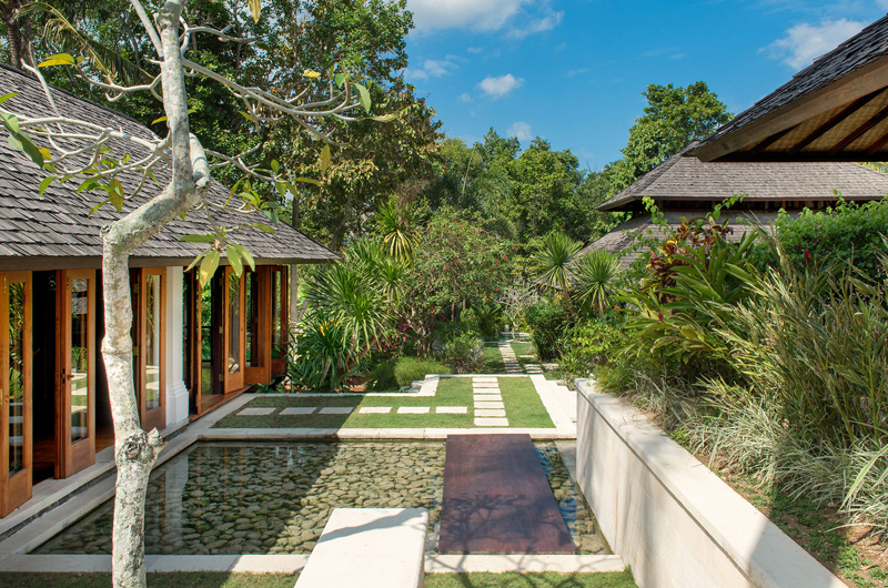 Villa Pangi Gita has three bedrooms. One room has a king-sized bed and two rooms have queen-sized beds. Each bedroom is housed in its own garden pavilion.