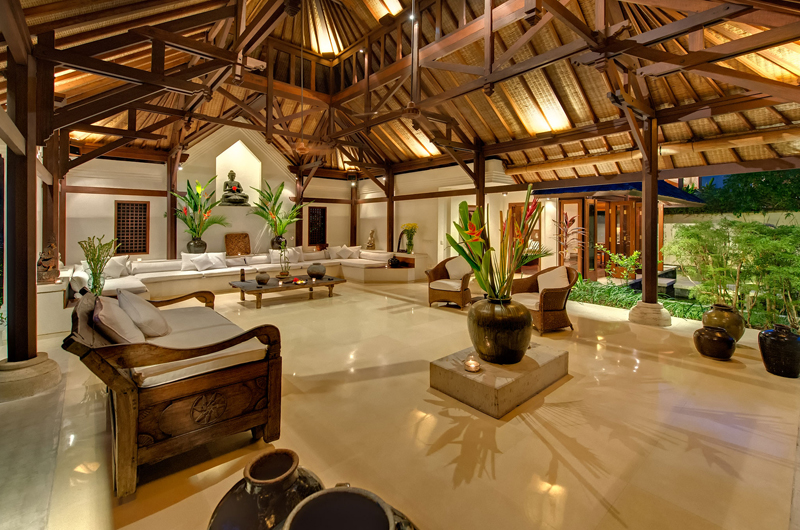 The open-sided living pavilion with its traditional two-tier roof, coconut wood pillars and cool cream terrazzo floors easily earns its place as the nexus of the property, perfect for entertaining and relaxing. The room is furnished with generous sofas.