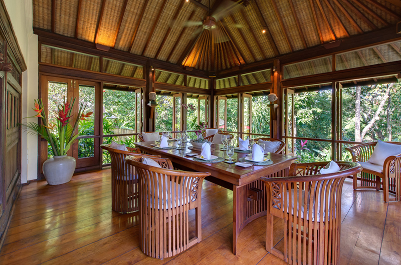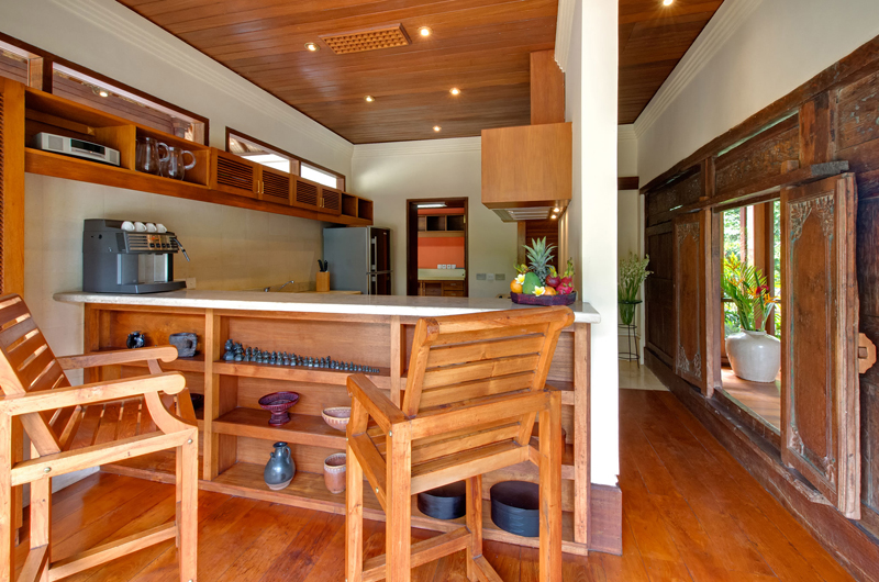 Stepping stones cross the fish pond to the elevated dining room that accommodates eight people and is enclosed on three sides by wood-framed glass doors to maximise the views. Guests can opt for air-conditioned comfort or leave the doors open to enjoy the song of the river and the fragrances of the garden. A hand-carved antique wall panel separates the dining room from the fully equipped-kitchen