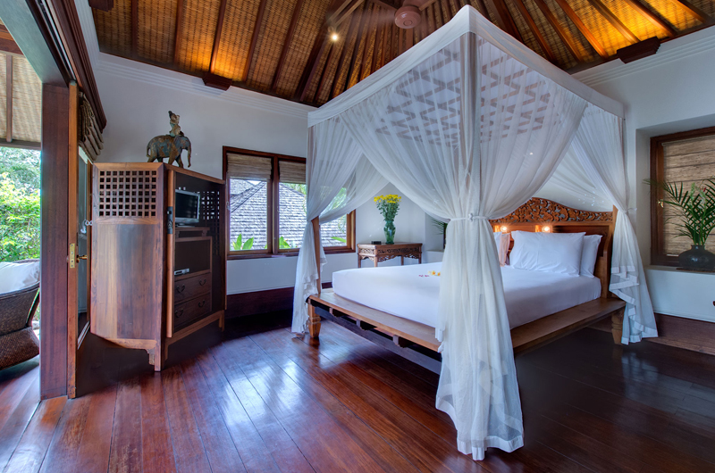 The master bedroom is housed in a pavilion close to the river and the pool. The room has a king-sized bed, a TV/DVD and an ensuite bathroom with a sumptuous bathtub and a private massage balcony.
