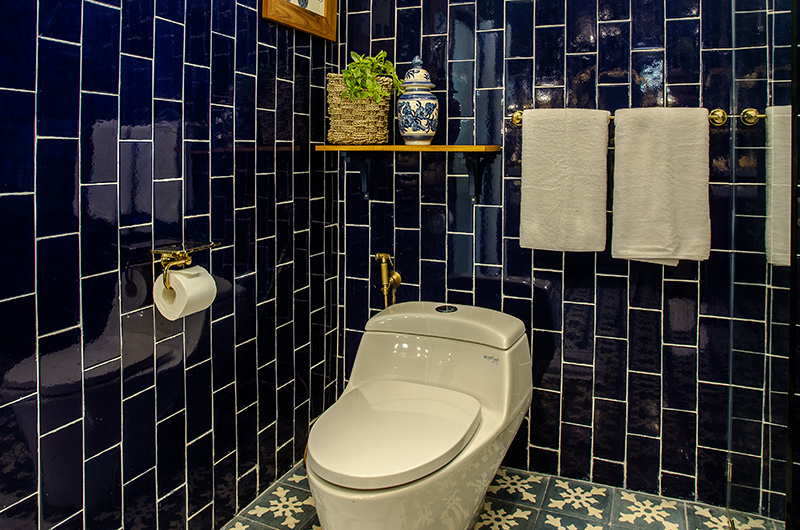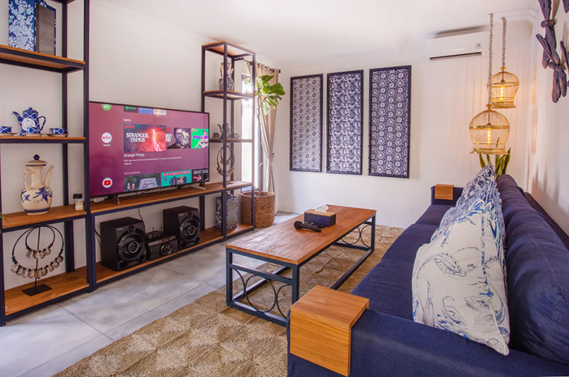 The living room offers an air-conditioned break amidst the tropical weather with full-wall glass providing lush views of the garden. The fluid space incorporates both the living and dining areas into the same space, with cream-coloured sofas decorated with blue hued pillows offering a relaxed setting for swapping stories gathered around the island. Next door, a cosy TV lounge with a teal blue sofa facing a 60-inch Android TV offers the perfect setting for hosting a movie night or even a karaoke party!