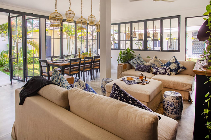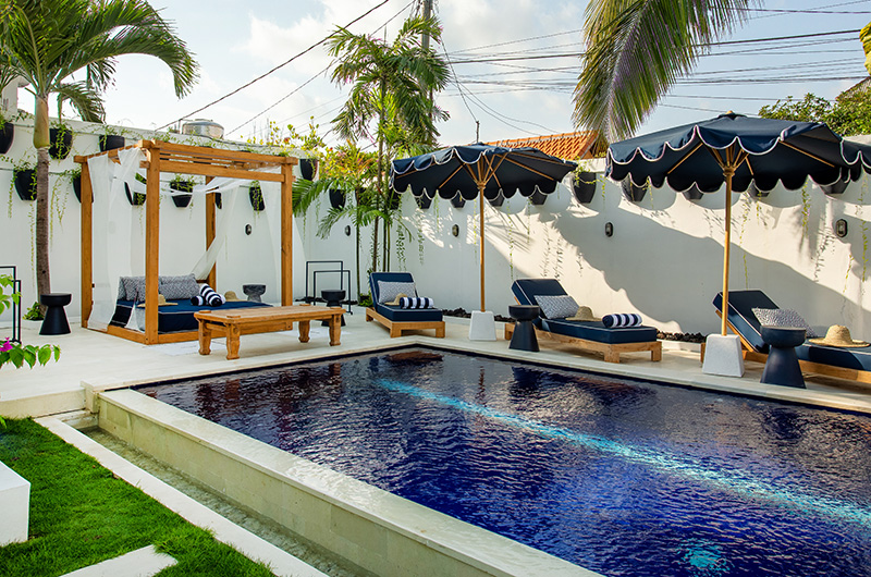 The villa is surrounded by luminous white walls, providing a peaceful and luxuriously private setting in the heart of Seminyak. The highlight of the green garden is the shimmering blue pool which measures at 10 x 4 metres in size. The poolside deck is just as photogenic as the villa itself, with a row of royal blue day beds and parasols complemented by a dreamy poolside cabana.