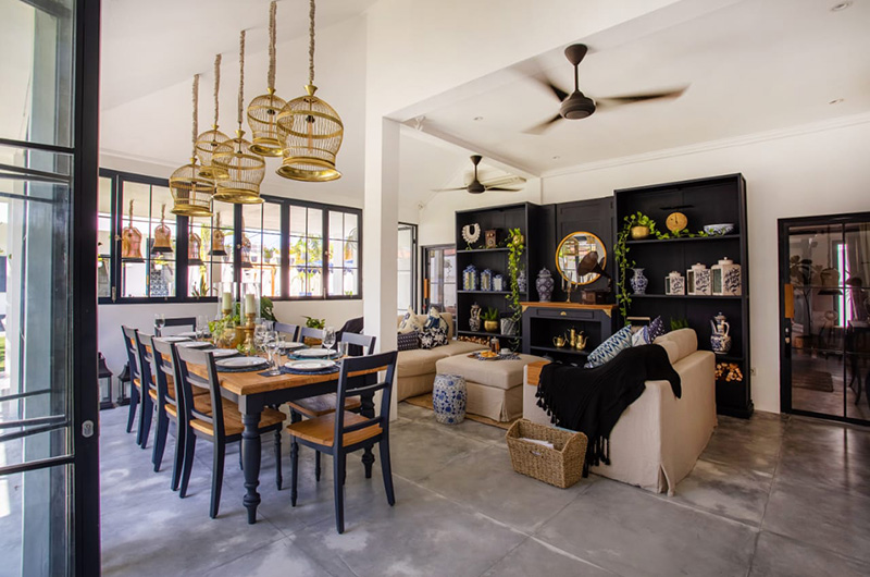 Meals can be enjoyed outside on the shaded patio where a wooden dining table sits surrounded by wicker chairs, offering an ideal setting for alfresco dining. If you prefer to dine indoors in the cool of the AC, gather around the dining table surrounded by 10 chairs. Adjacent to this indoor dining area is the villa’s fully-equipped kitchen.