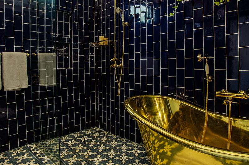 The second bedroom is located on ground level in the garden annex. This room is furnished with a king-sized bed and a TV with plenty of space for storing your luggage and personal belongings. The ensuite bathroom comes with a luxuriant brass bathtub.