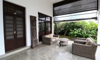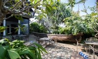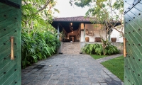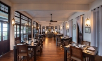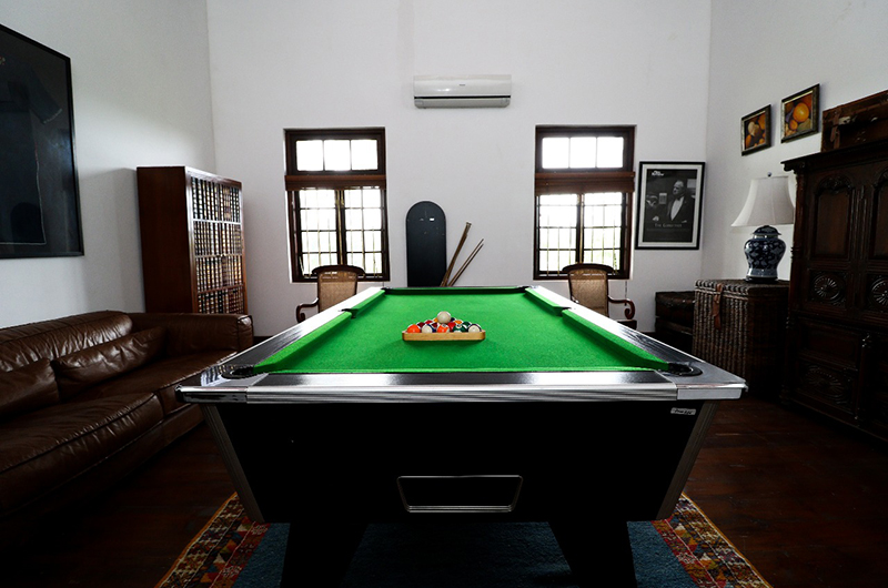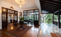 The villa’s refined interiors capture a more elegant point in time, with a beautiful library room furnished with plush sofas and plantation stairs. French windows open to views of the garden, though the space can also be enclosed for air-conditioned comfort when desired.