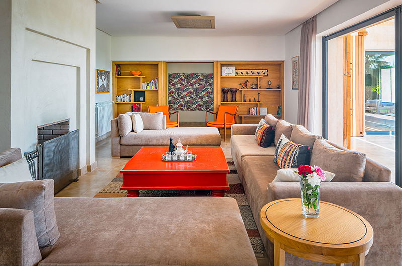 True to the villa’s spectacular stature, Villa Salamouni houses several lavish living areas overlooking the villa’s sun deck and offering splendid views of the garden and pool. Featuring a generous grey sofa, a couple of comfy armchairs and a log fireplace, the main lounge is lined with bifold timber doors opening to a terrace housing an alfresco dining table. A smaller lounge is located next to the living room and offers a plush couch, TV and a selection of books for in-villa entertainment. Perhaps the coolest place to hang out is the swanky rooftop lounge complete with shaded sofas, table tennis and an atmospheric fireplace, with panoramic views overlooking the estate.