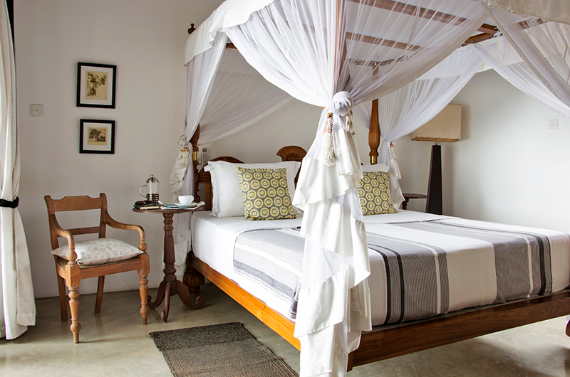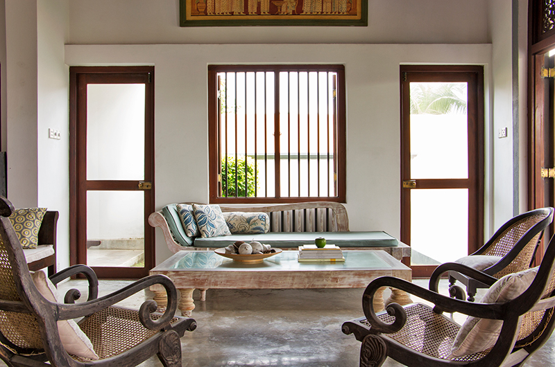 Villa Saldana’s fan-cooled living room is located at the heart of the villa. The room is furnished with Sri Lankan furniture and a 40-inch flatscreen TV with satellite channels and a Blu-Ray player.