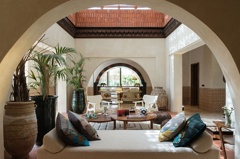 The living areas feel wonderfully Moroccan thanks to their earthy colour scheme and arched doorways, with ornate textiles and curios adding to the exotic feel. The main living room features white sofas and tan armchairs, with a beautiful fireplace adding a warm glow.