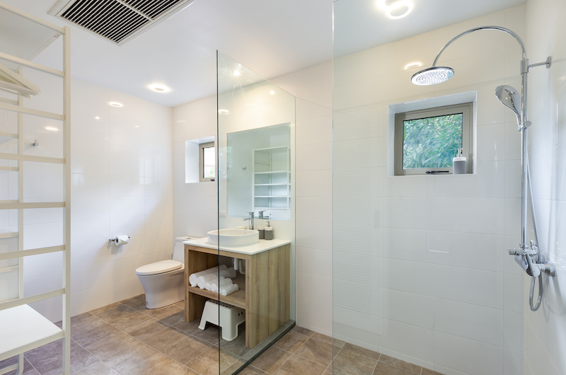 Also located in the living room, Villa Sand’s indoor dining table is surrounded by six chairs. Most of your meals, however, will likely be served out on the terrace where a large white table can accommodate the whole group of 10 on matching chairs. This covered space is cooled by ceiling fans, allowing guests to enjoy outdoor dining while still keeping nice and cool. Located a bit further back, Villa Sand houses both a Western style kitchen and a separate Thai kitchen for spicier local cooking.