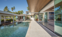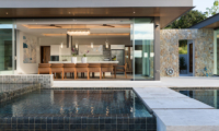 The dining room occupies its own pavilion, located a few stops from the living room pavilion with beautiful views of the pool. This is a beautiful space (with an adjoining kitchen) for enjoying meals in air-conditioned comfort. Or perhaps you’d prefer to dine in the stunning sunken dining area by the pool instead?