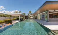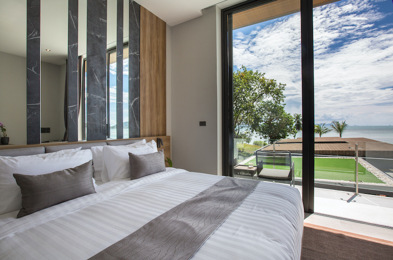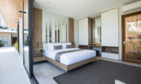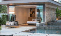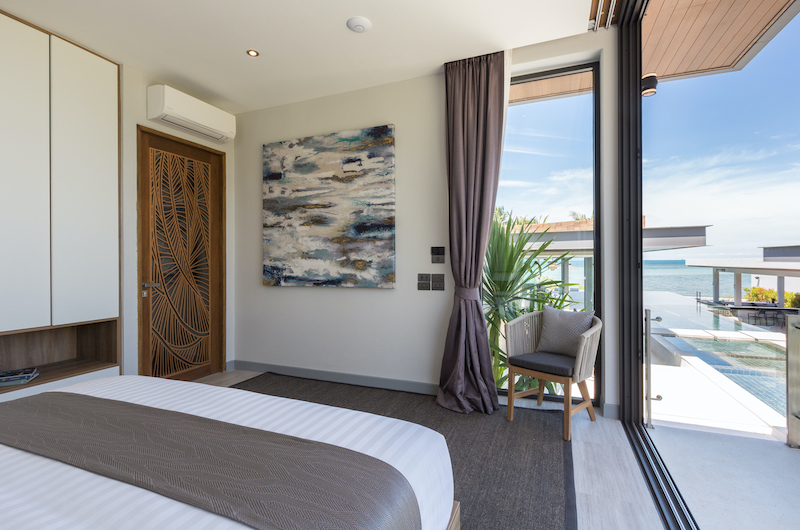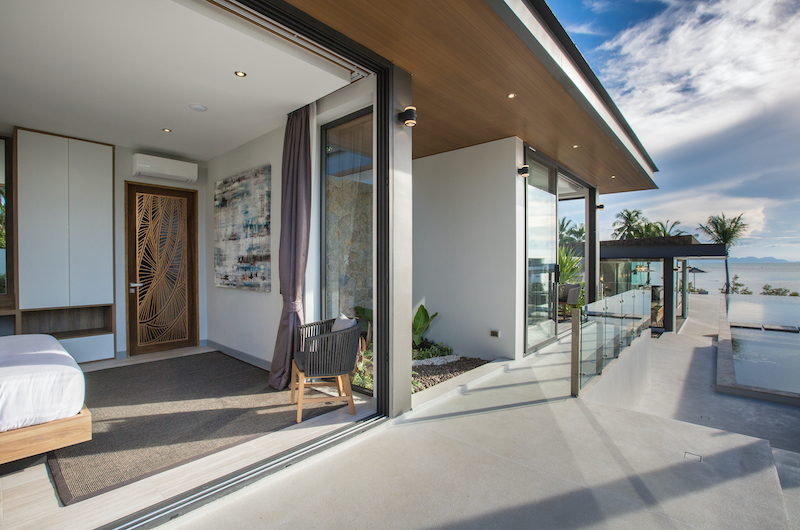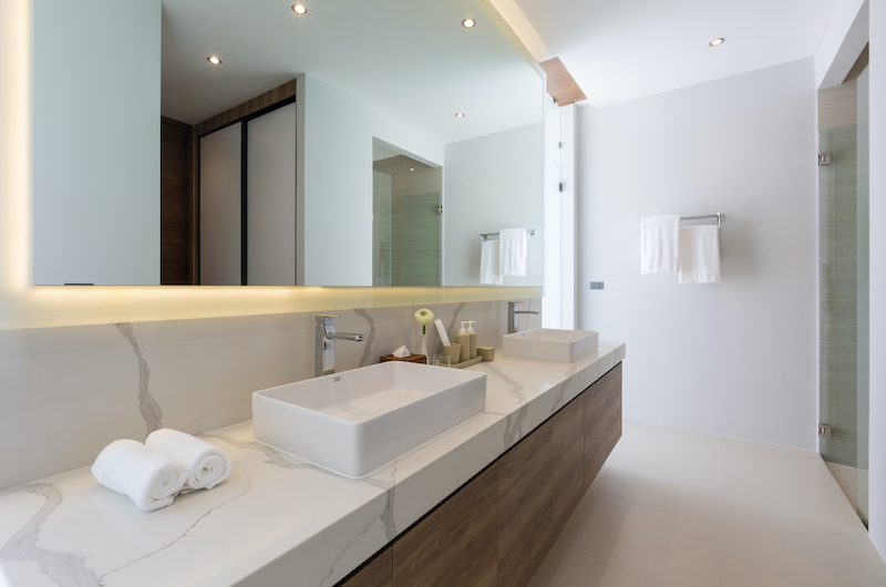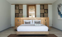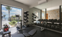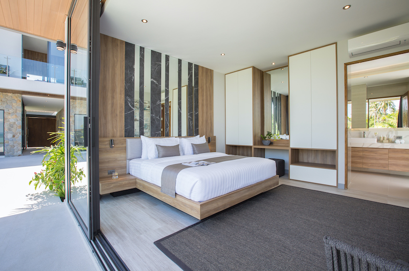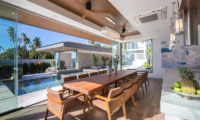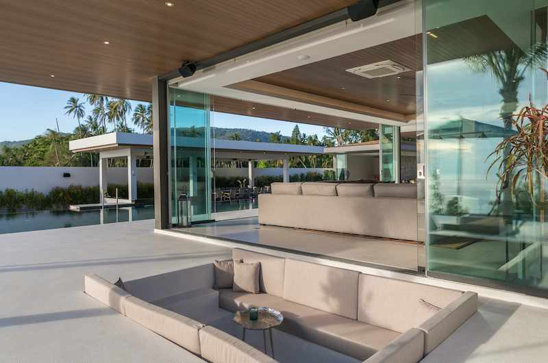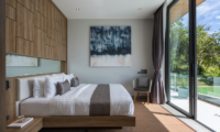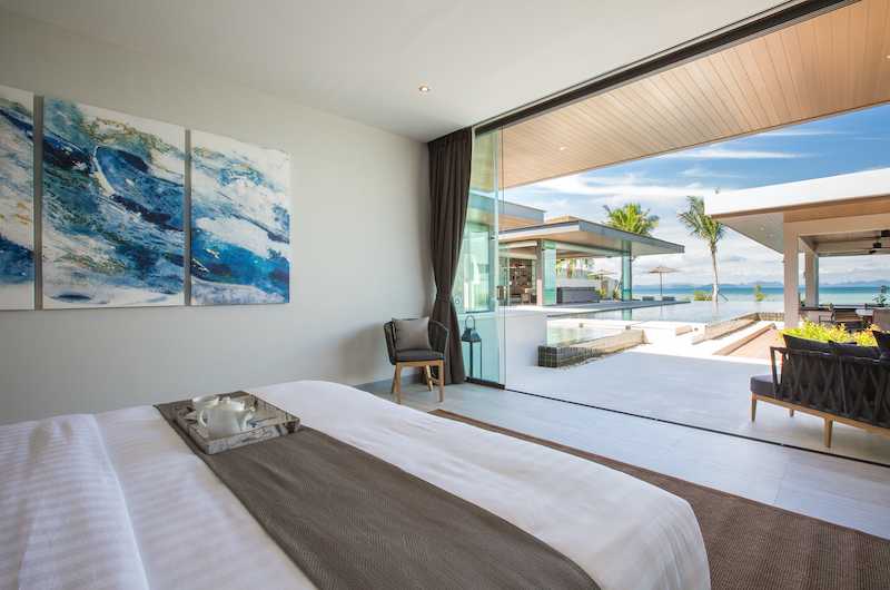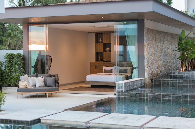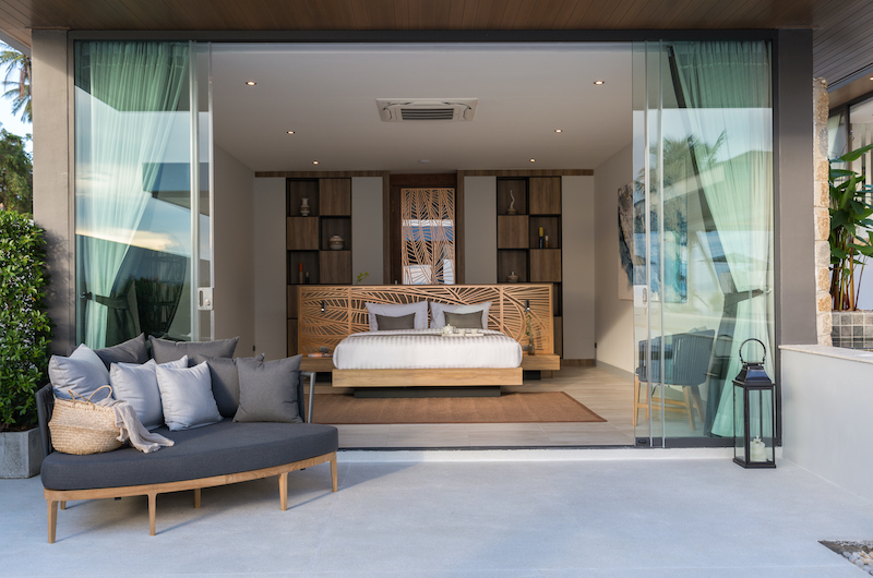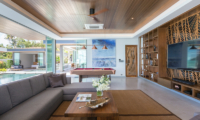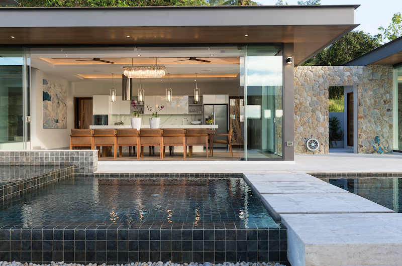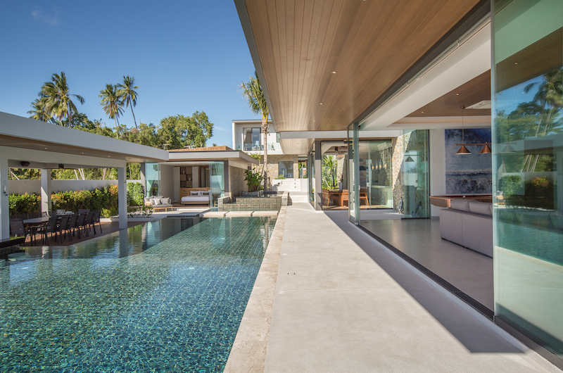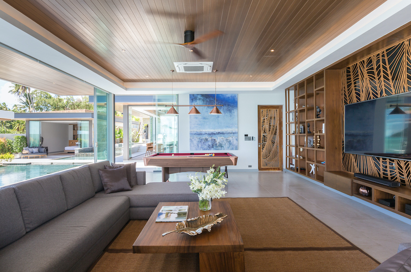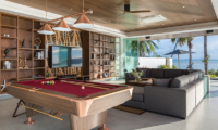 The living room is a stunning space surrounded by full-wall glass, ensuring the best possible views of the villa’s seductive pool as well as the ocean glimmering beyond. When the glass doors are closed, guests can relax in air-conditioned comfort. The room has a plus, U-shaped sofa positioned before a huge flatscreen TV, plus a pool table to keep you entertained.