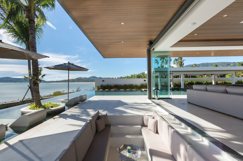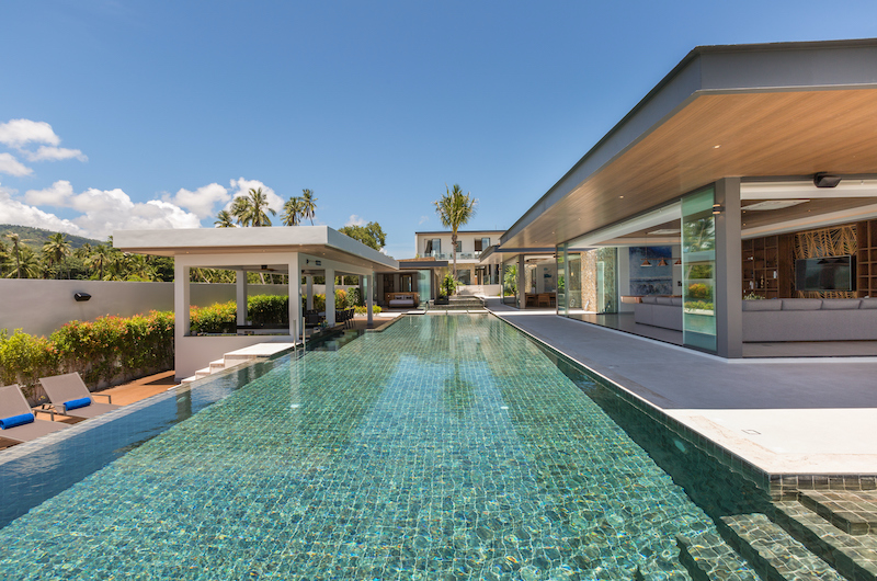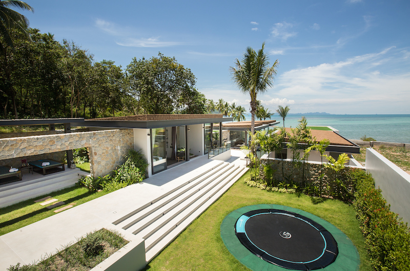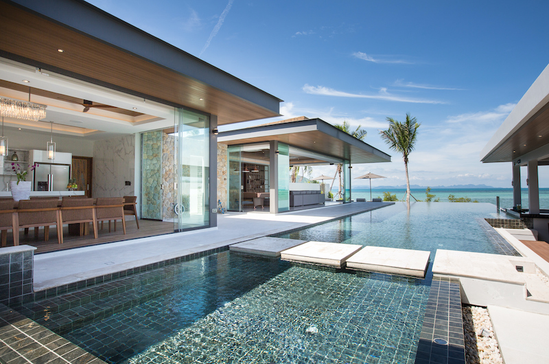 Villa Sea Renity is a seven-bedroom beachfront villa that’s divided into multiple pavilions. Six of the bedrooms feature king-sized beds, while one comes with three sets of bunk beds. The villa features enclosed living and dining areas, a cinema room, sauna, massage pavilion, seven bedrooms, outdoor trampoline, 21-metre long lap pool and a 0,7-metre deep kiddie pool.