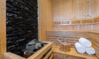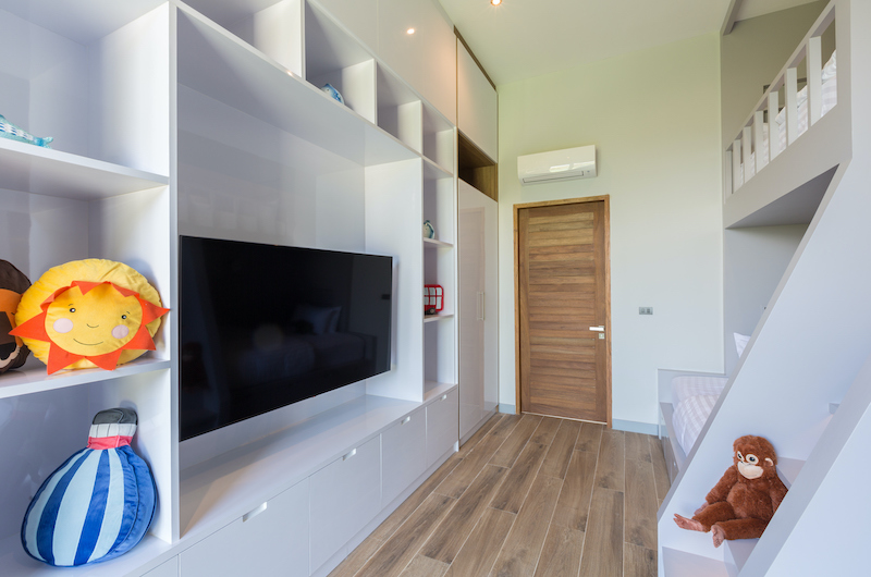 The bunk room can sleek up to six kids, as there are two bunks with single mattress up top and double on the bottom. Beside the bunk beds, the room has built-in wardrobes, plenty of storage space and a large wall-mounted TV with Netflix. The room also has its own shower room.