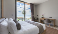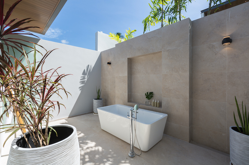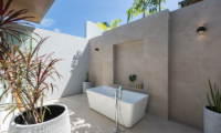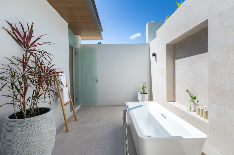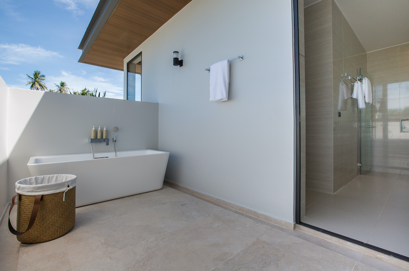 The second bedroom is located a level above the master suite, overlooking the dining pavilion, the pool and ocean. This room comes with a king bed, bedside reading lamps, table and chairs plus universal sockets and USB ports for re-charging phones and tablets. Black-out curtains allow guests to sleep in at their leisure. The ensuite bathroom has a toilet, sink and power showers, plus a decadent outdoor bathtub.