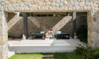 The master bedroom takes pride of place housed in its own pavilion right by the pool. This grand room features a king-sized bed, bedside reading lamps, table and chairs plus universal sockets and USB ports for re-charging phones and tablets. Black-out curtains allow guests to sleep in at their leisure. The master bathroom features a delightfully private outdoor bath, as well as an indoor toilet, sink and power showers.