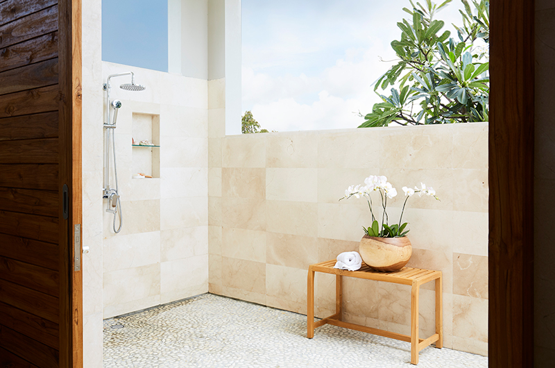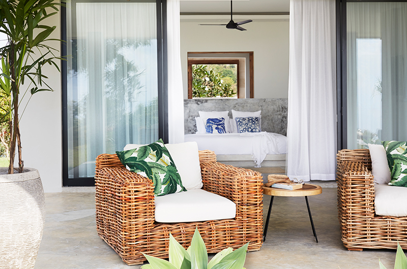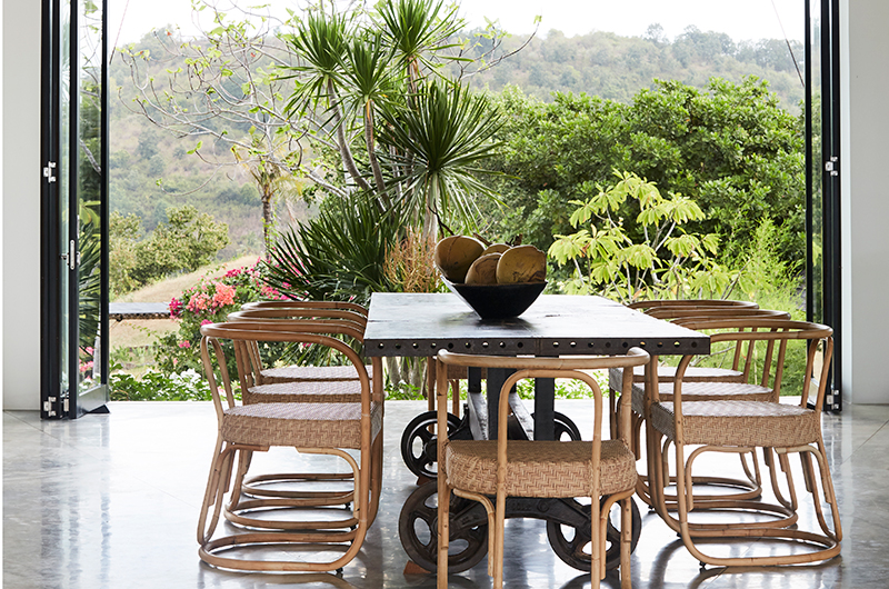 An eight-seater dining table sits at the centre of the the air-conditioned living room, offering lush views through glass doors. Most of your meals, however, will undoubtedly enjoyed in the barbecue pavilion by the pool, with views looking out to the ocean beyond. The villa even has its own wood fire pizza oven – the only one of its kind on the island!