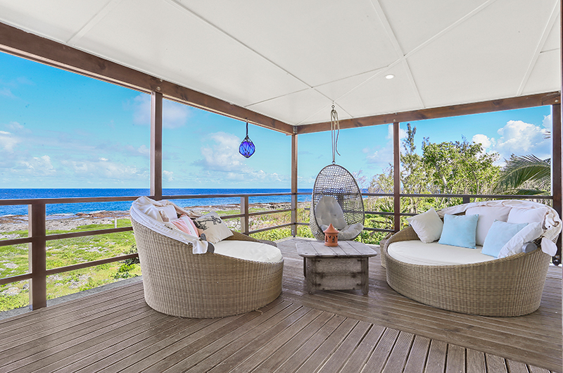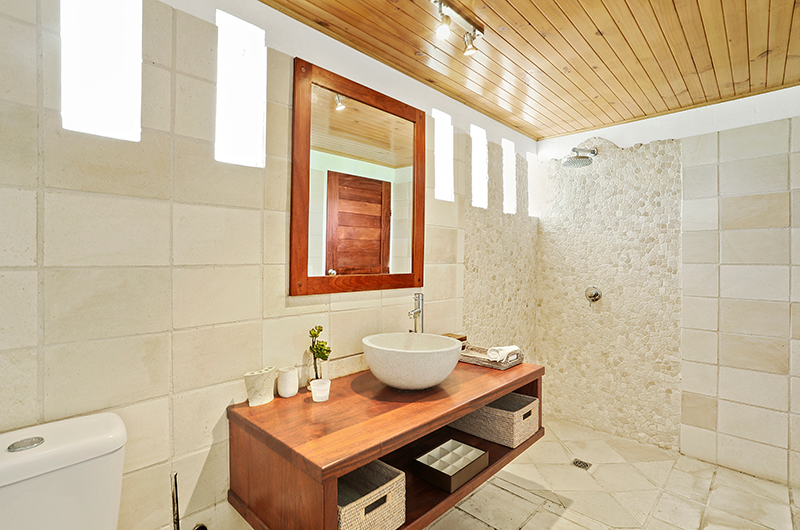 Strategically located on the villa’s upper floor, the fan-cooled living room offers panoramic 180-degree views of the Pacific Ocean. The living room is styled with modern rattan furniture and masterfully carved wooden statues. More seating is available on cosy nest chairs, dreamy daybeds and a breezy hammock out on the roomy balcony where you can also catch the fresh ocean breeze