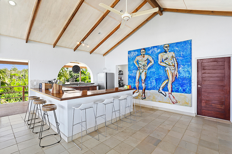 Also housed on the upper floor, Villa Senang Masari’s dining table offers the same blue views of the ocean with ceiling fans keeping things nice and fresh. Behind the dining area is the villa’s beautifully styled kitchen, with more seating available on bar stools lining the breakfast bar. A stainless steel barbecue is available on the adjoining terrace.