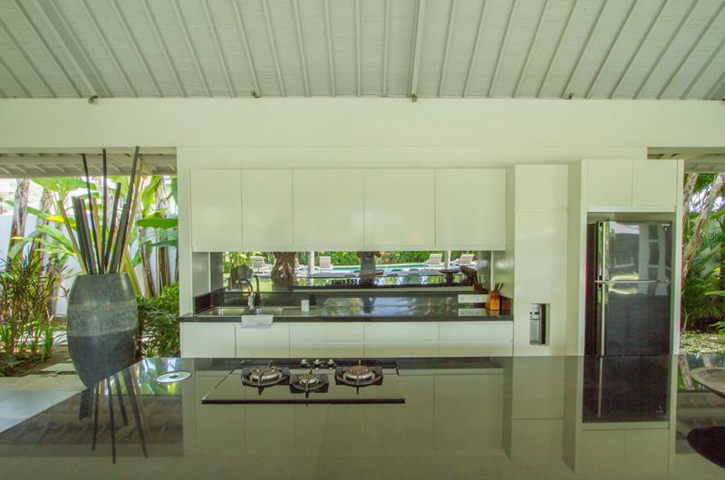 Villa Senara’s manicured green gardens centre around a 14-metre swimming pool surrounded by sun lounges and a shaded bale with soft cushions. The pool includes a shallow section so kids can enjoy the pool safely. The villa is surrounded by generous lawns fringed palm trees, so there’s plenty of room to play around and relax.