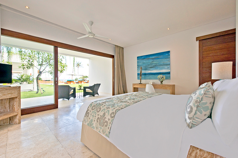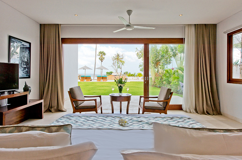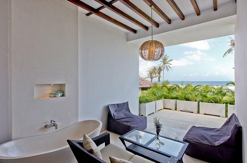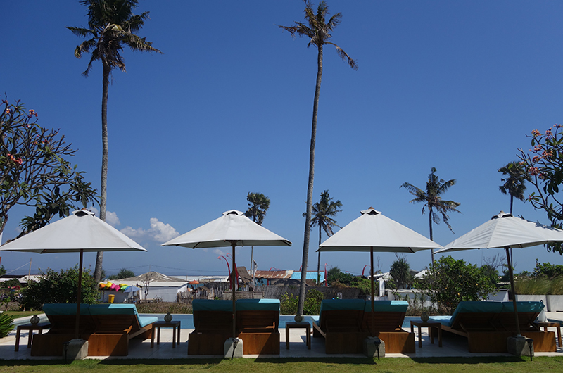 Surrounded by generous lawns, Villa Shaya’s 16-metre long swimming pool is lined with turquoise sun beds and white parasols offering a delicious choice between sun and shade. Guests can reach the beach in a short walk down the garden stairs and between the local warungs lining the sand. The villa grounds also include a stylish shaded lounge and a breezy rooftop terrace.