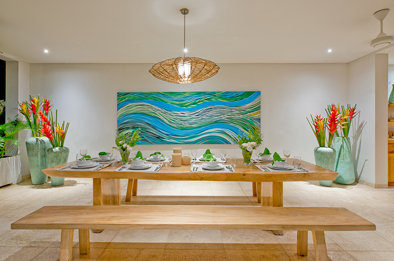 The dining area is built into the living room, with a generous wooden dining table surrounded by 12 chairs and lit up by a beautiful shell chandelier. The villa includes a separate fully-equipped kitchen.