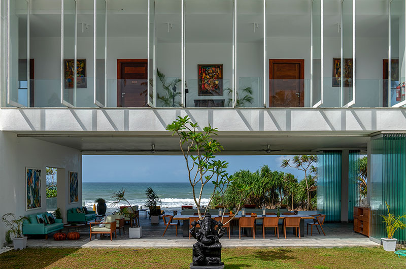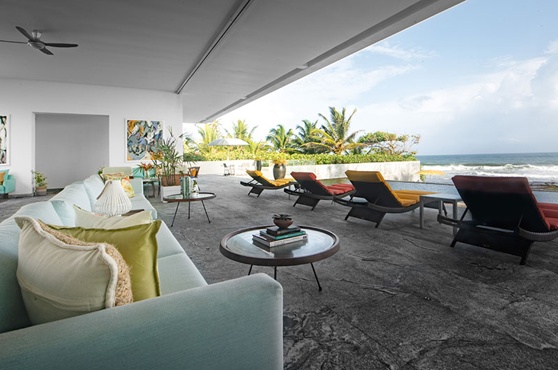 The pool level is dedicated to breezy ocean-front living with open-sided living areas offering direct views of the pool and the beach. Ample sofas in tropical hues of green and turquoise offer ample room for the whole group, with eclectic textiles and art pieces adding interest to the space.