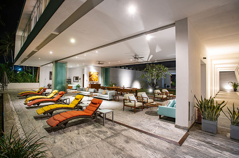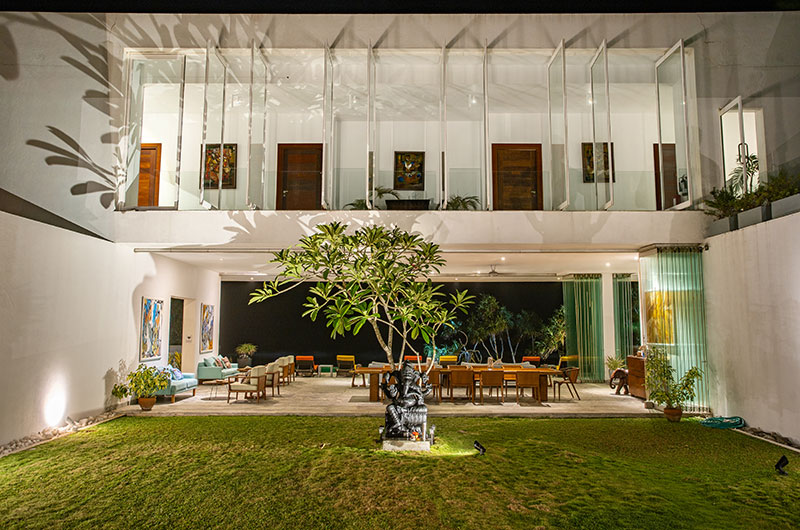 Villa Sielen Diva is a seven-bedroom villa that’s built over three levels. The main ground level includes open-sided living areas and one bedroom. The lower beach lawn houses two bedrooms and the upper floor houses four more bedrooms. The villa has a 17 x 6 metre swimming pool and offers direct access to the beach.