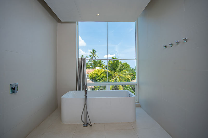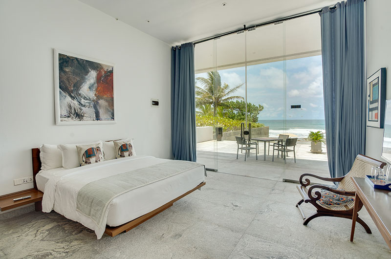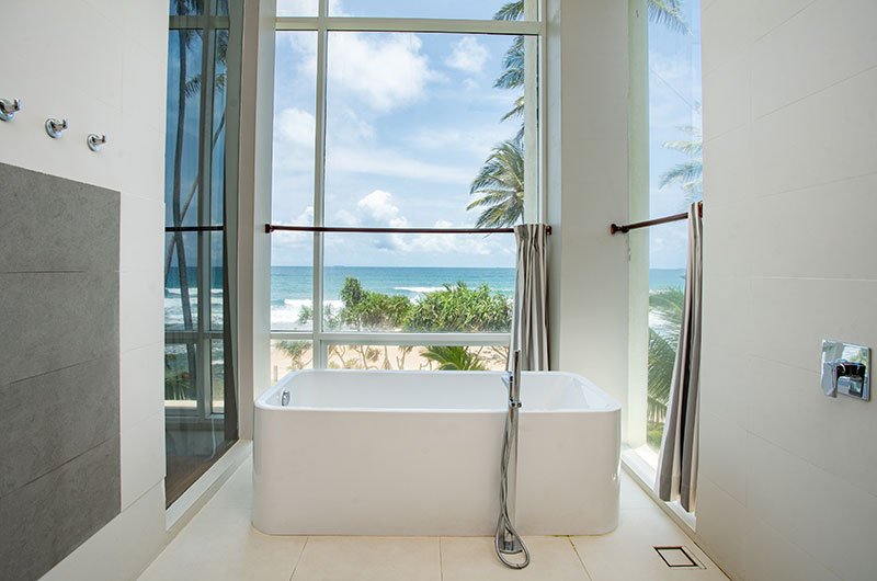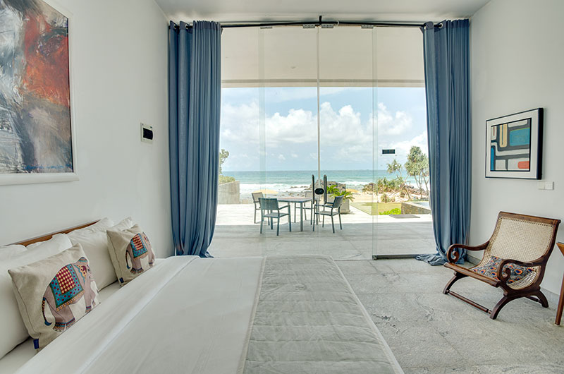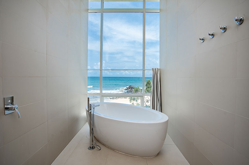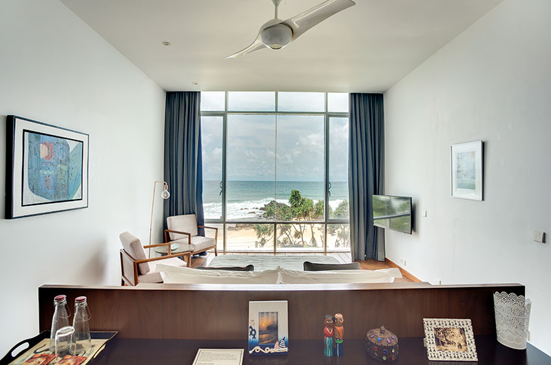 The Mayil bedroom is also located on the first floor and offers ocean views. The room has a queen-sized bed, a TV and an ensuite bathroom with a bathtub and shower.
